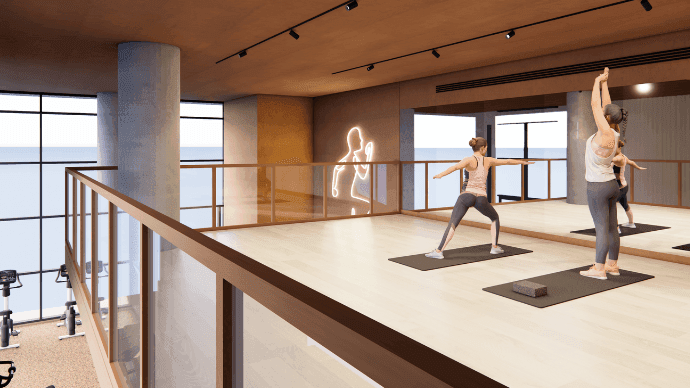 Enjoy a lifestyle of convenience and luxury with a 24-hour gym and dedicated zones for stretching, yoga, and pilates. Unwind in the Wellness Hub, complete with a sauna, steam room and invigorating cold plunge. Stay productive in the Co-working Hub, featuring bookable meeting rooms, or relax in The Living Room - a cozy resident lounge with a fireplace and TV.